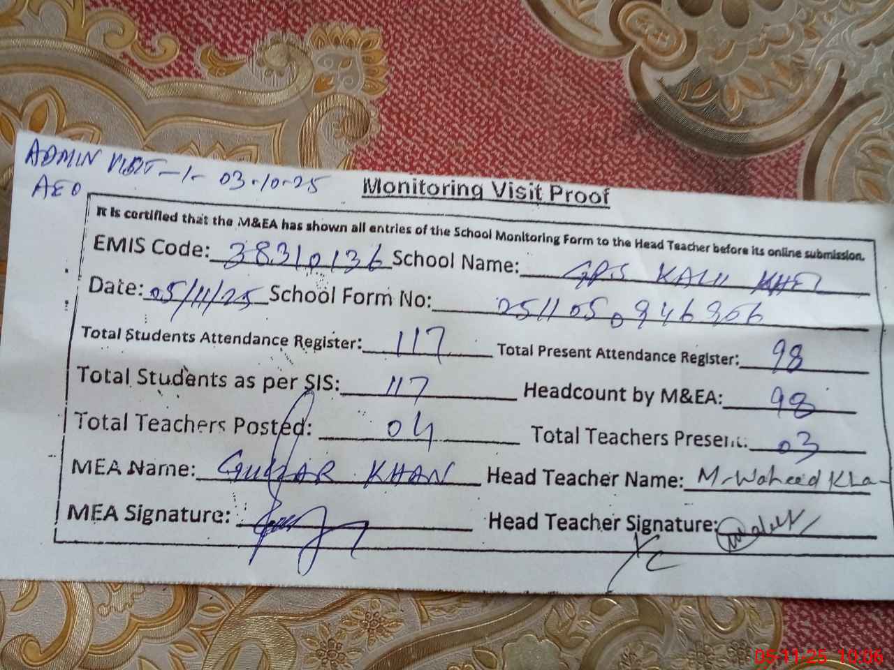 | Attendance Register | Head Teacher | MEA with School | Visit Proof |