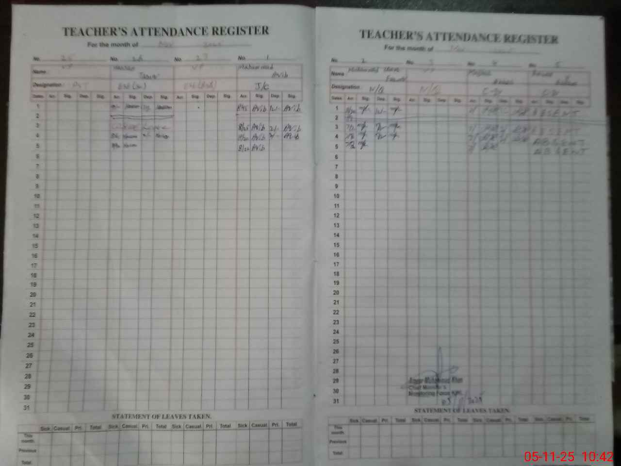 | CNIC | Full Name | Designation | R/C | Absence During Last Calender Month |