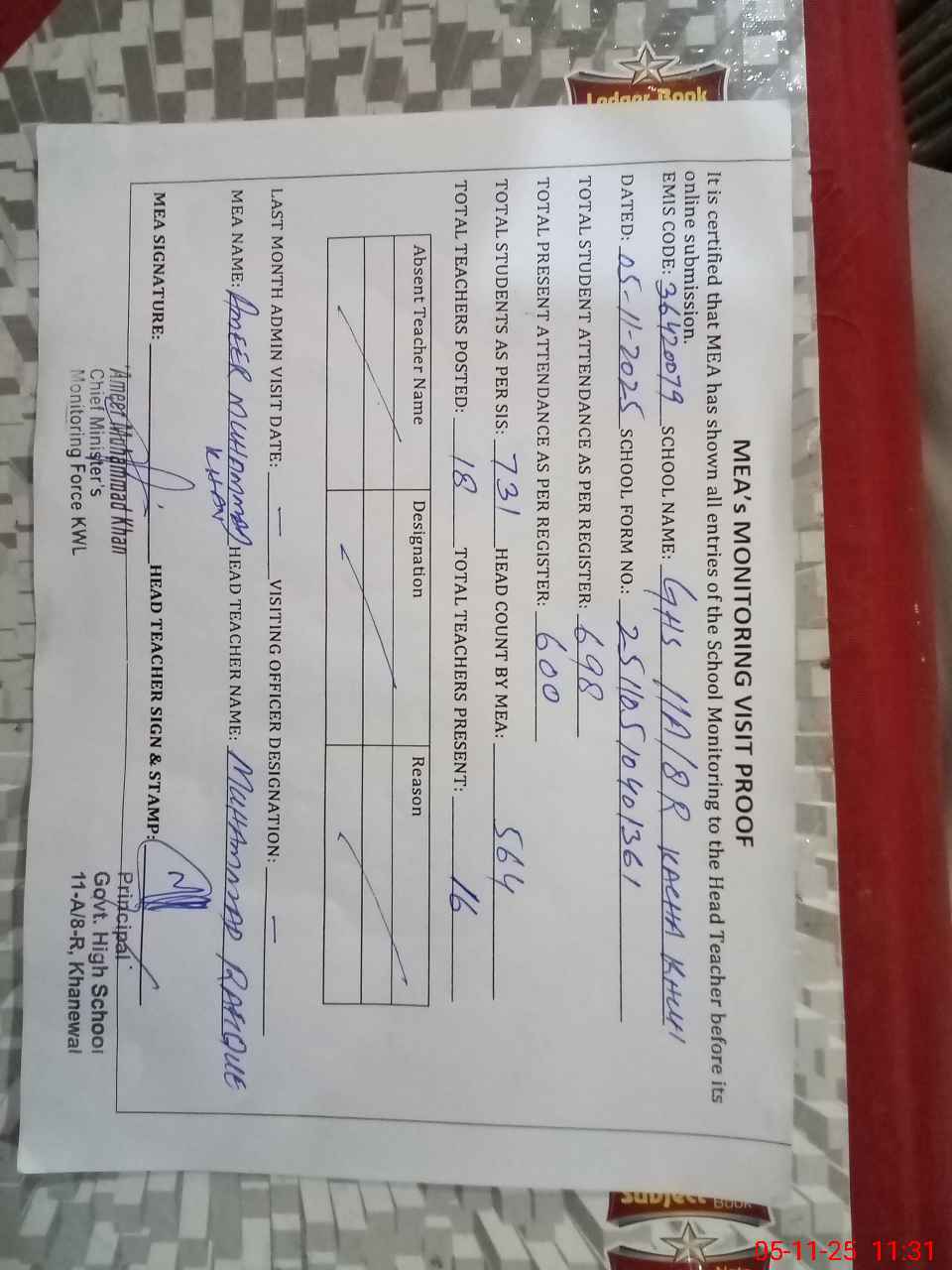 | Attendance Register | Head Teacher | MEA with School | Visit Proof |