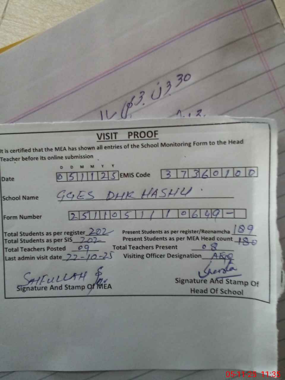 | Attendance Register | Head Teacher | MEA with School | Visit Proof |