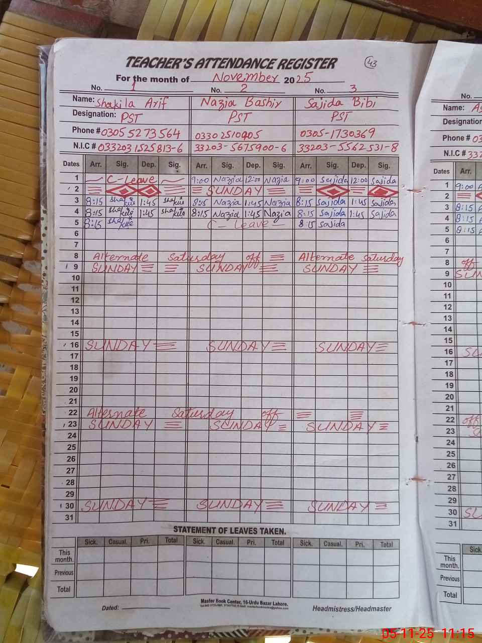 | CNIC | Full Name | Designation | R/C | Absence During Last Calender Month |