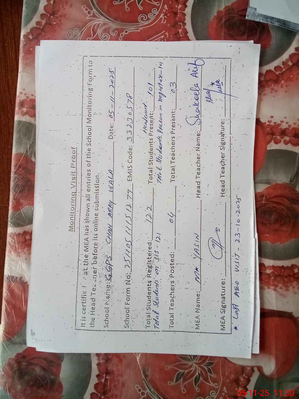 | Attendance Register | Head Teacher | MEA with School | Visit Proof |