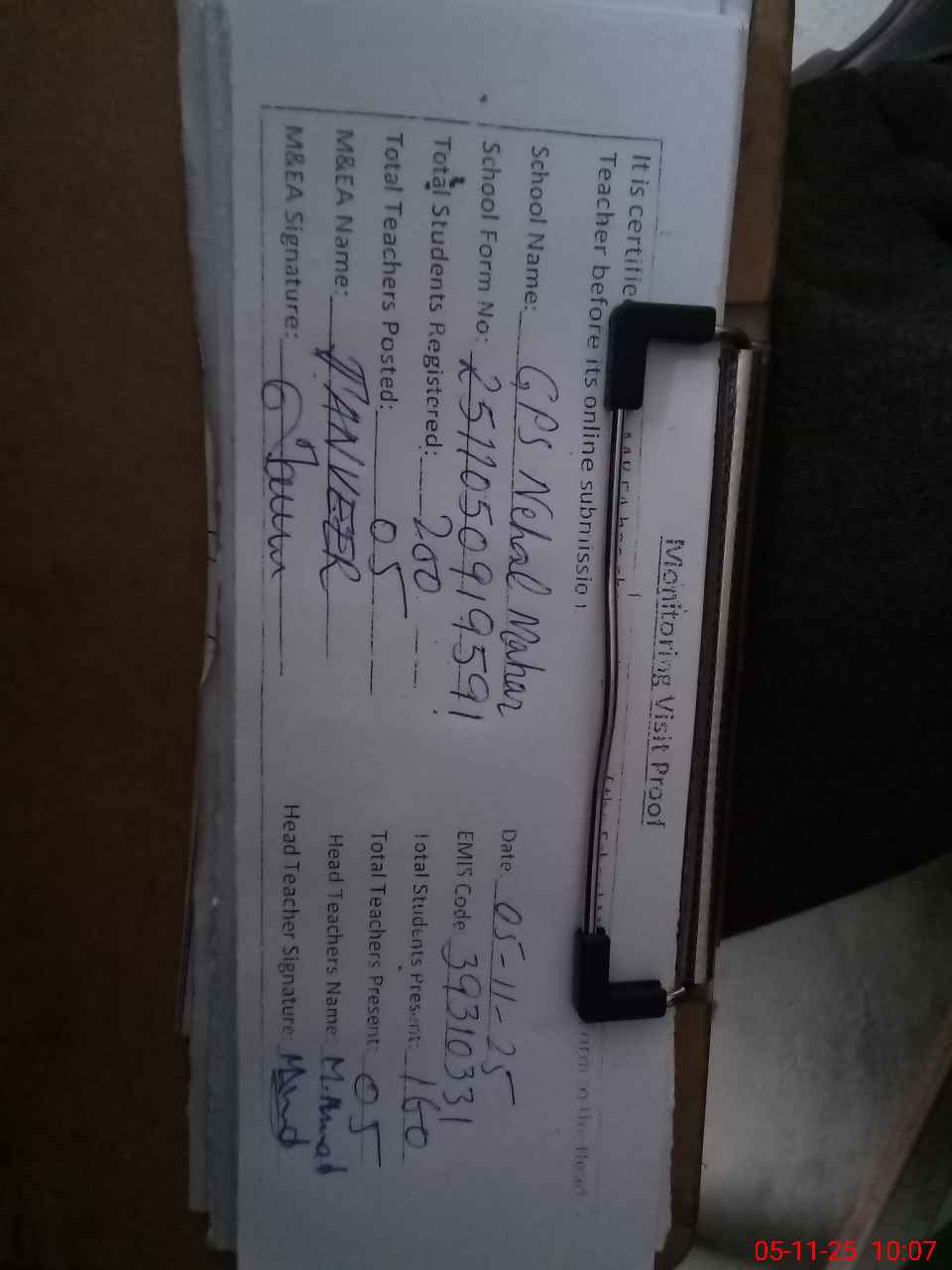 | Attendance Register | Head Teacher | MEA with School | Visit Proof |