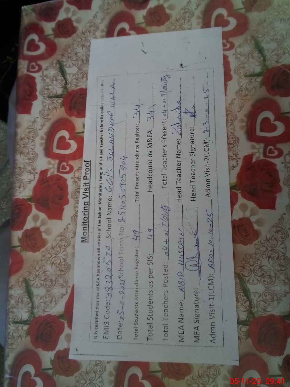 | Attendance Register | Head Teacher | MEA with School | Visit Proof |