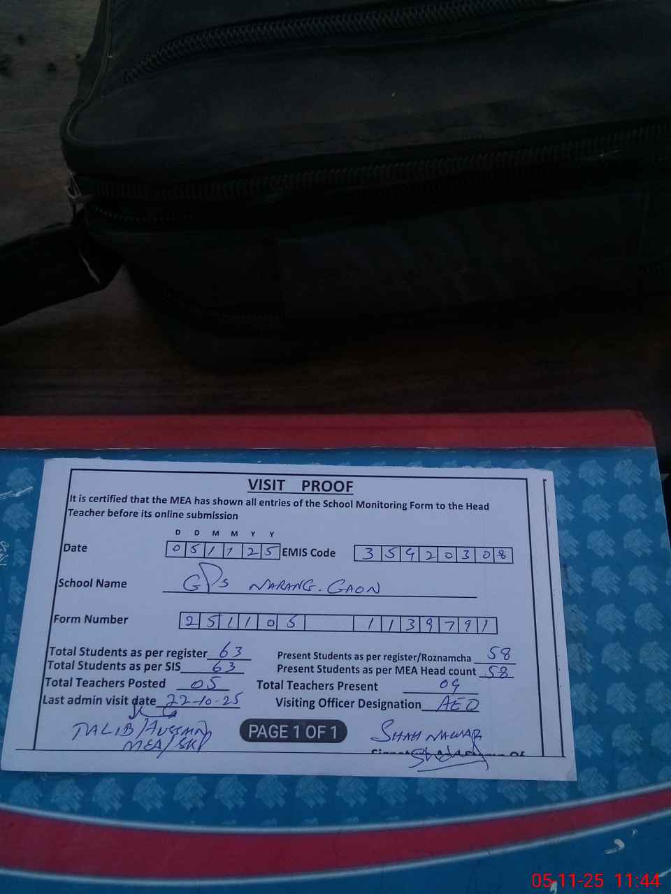 | Attendance Register | Head Teacher | MEA with School | Visit Proof |