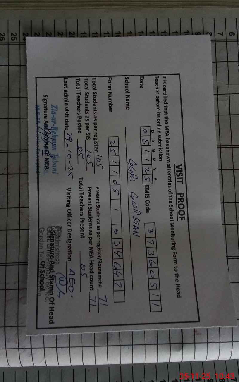 | Attendance Register | Head Teacher | MEA with School | Visit Proof |