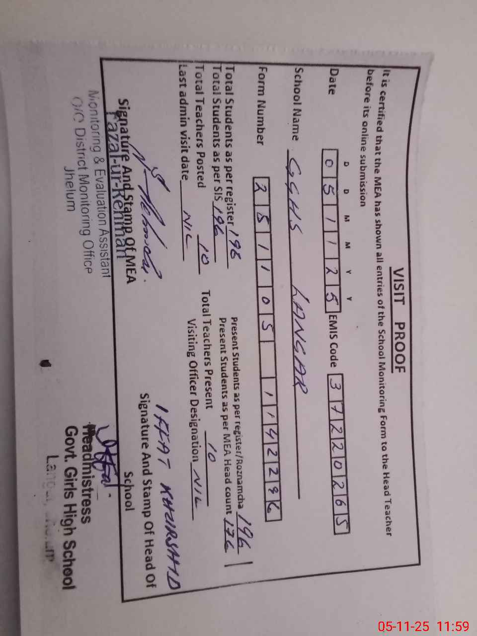 | Attendance Register | Head Teacher | MEA with School | Visit Proof |