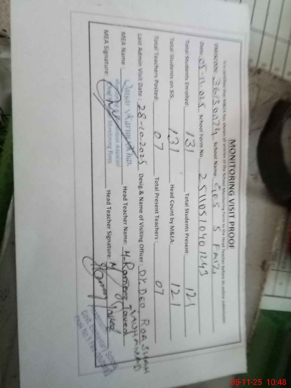 | Certified that this School was Inspected by the Undersigned MEA/DMO Today and the Information Stated Above is as Per Record. | |||||