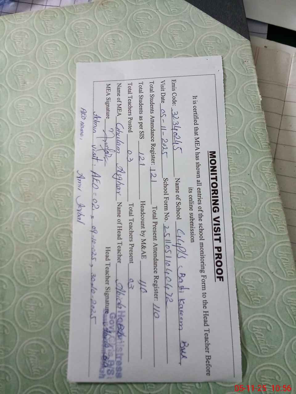 | Attendance Register | Head Teacher | MEA with School | Visit Proof |