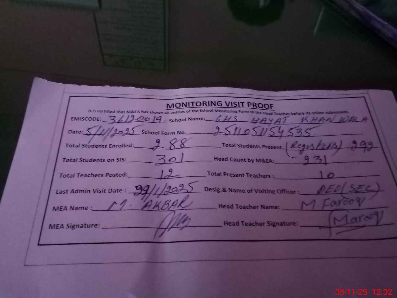 | Attendance Register | Head Teacher | MEA with School | Visit Proof |