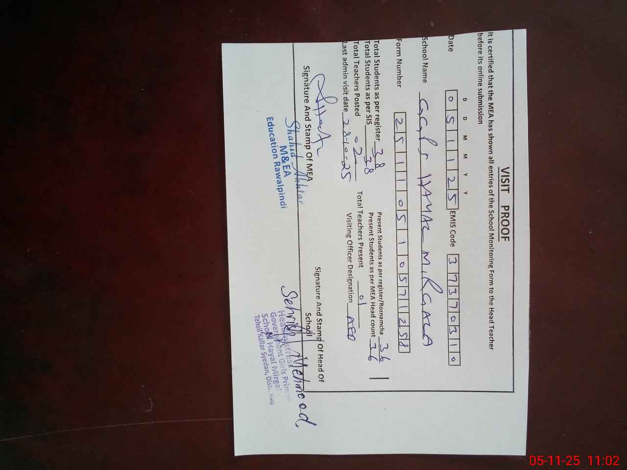 | Attendance Register | Head Teacher | MEA with School | Visit Proof |