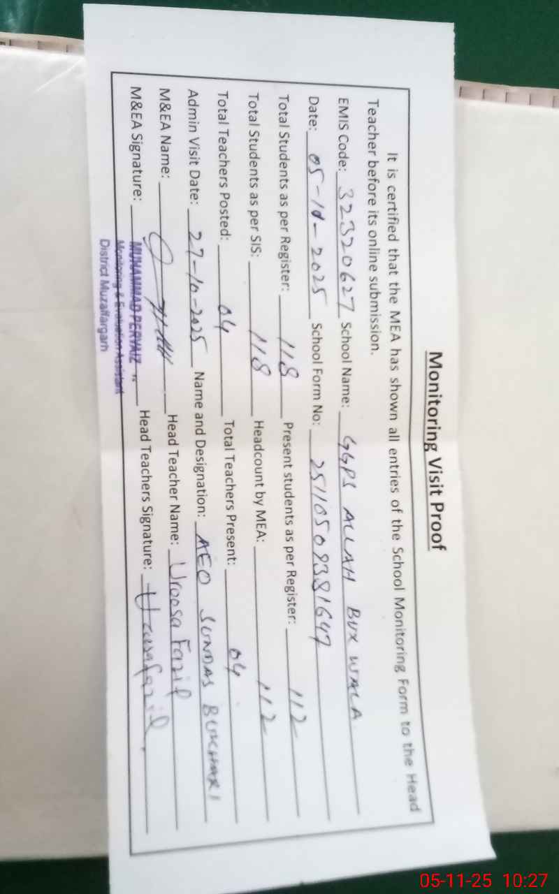 | EMIS Code: 32320627 | Name of School: GGPS ALLAH BAKHSH WALA | |||