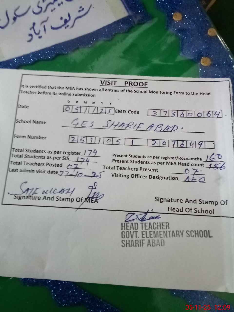 | Attendance Register | Head Teacher | MEA with School | Visit Proof |