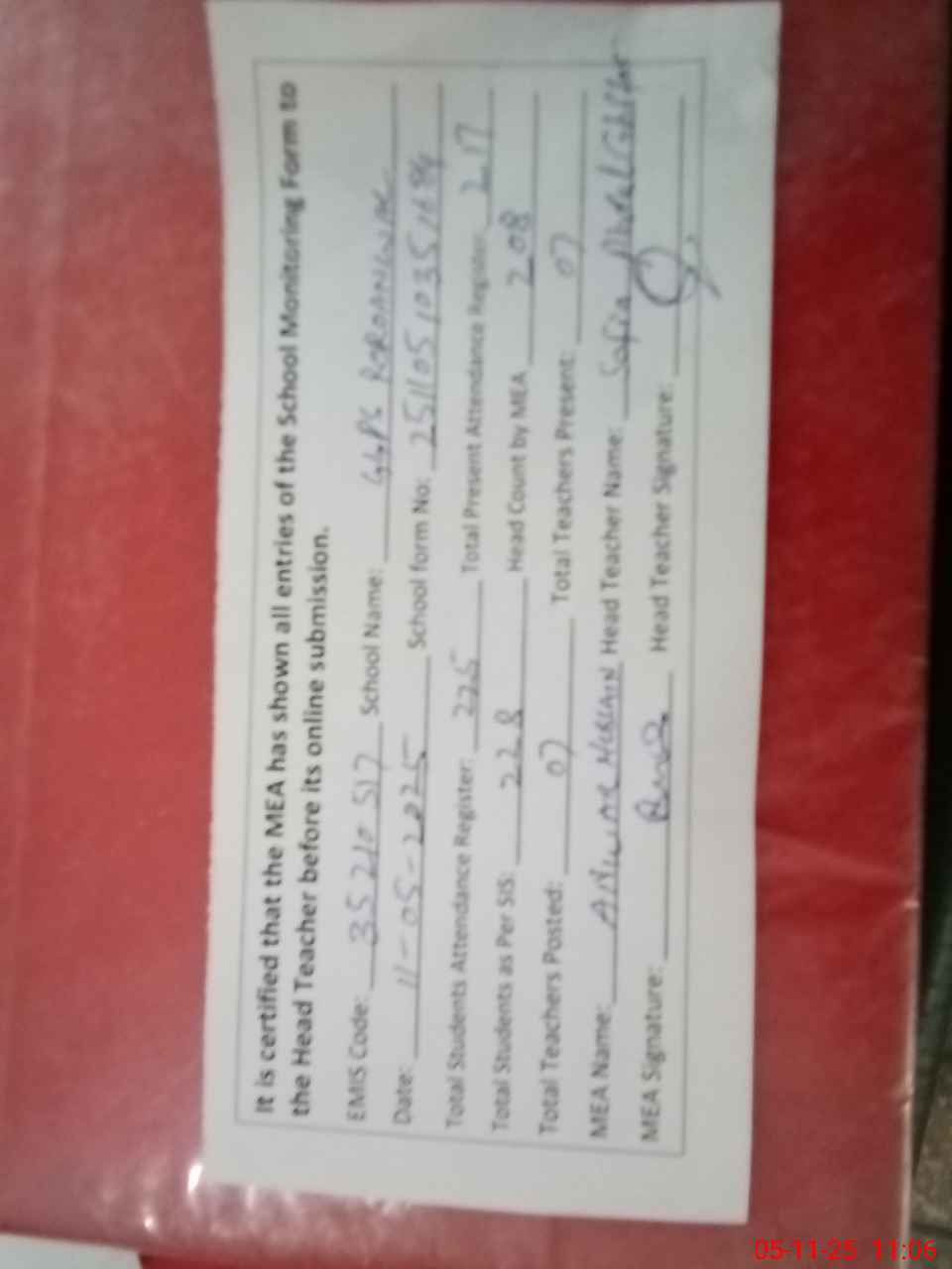 | Attendance Register | Head Teacher | MEA with School | Visit Proof |