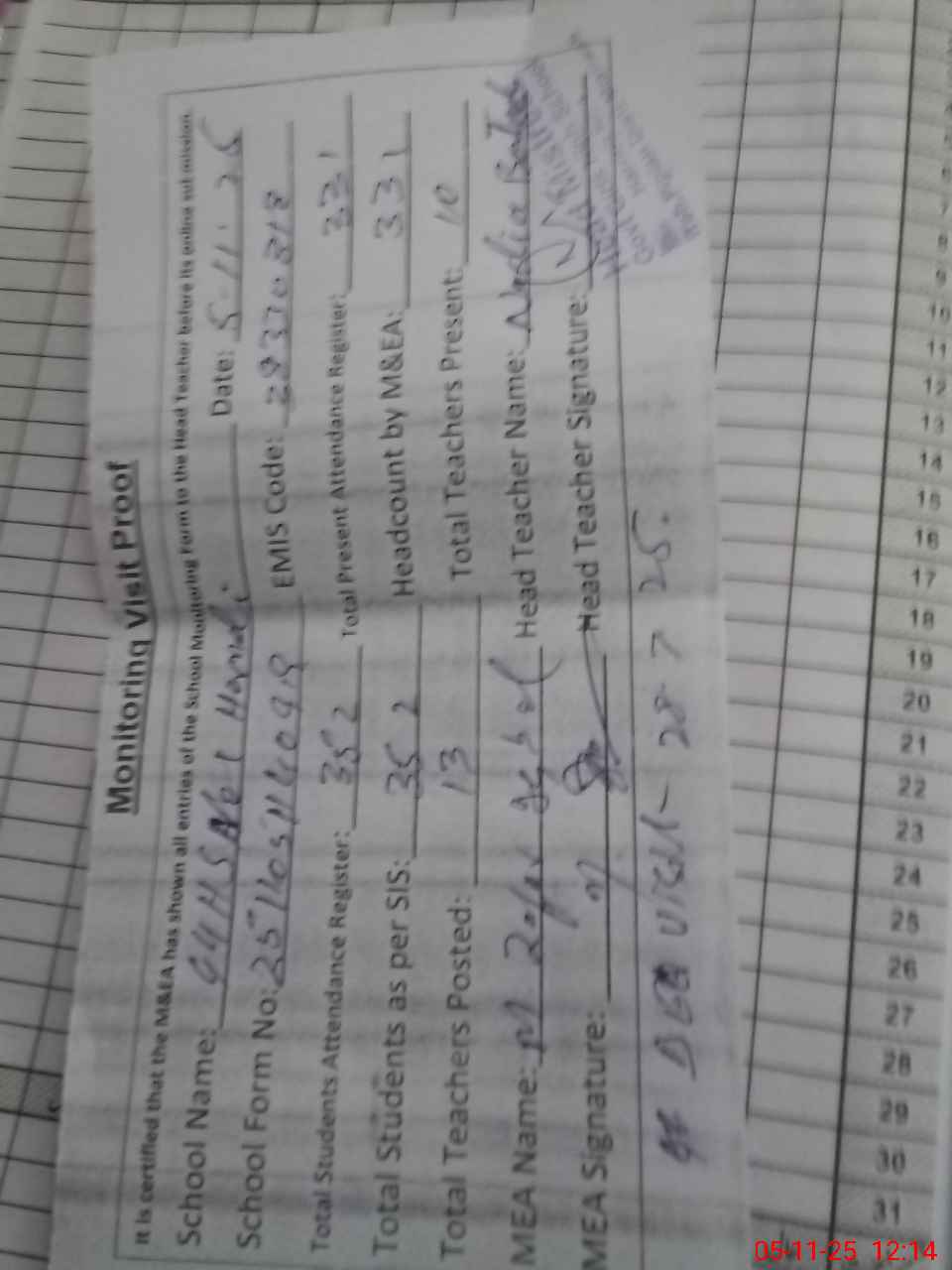 | Attendance Register | Head Teacher | MEA with School | Visit Proof |