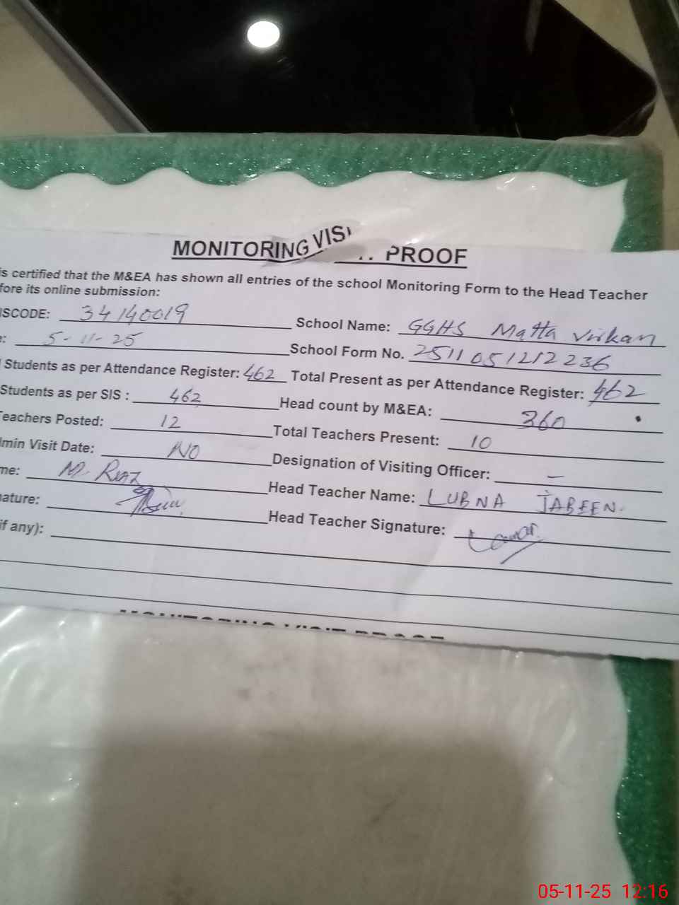 | Attendance Register | Head Teacher | MEA with School | Visit Proof |