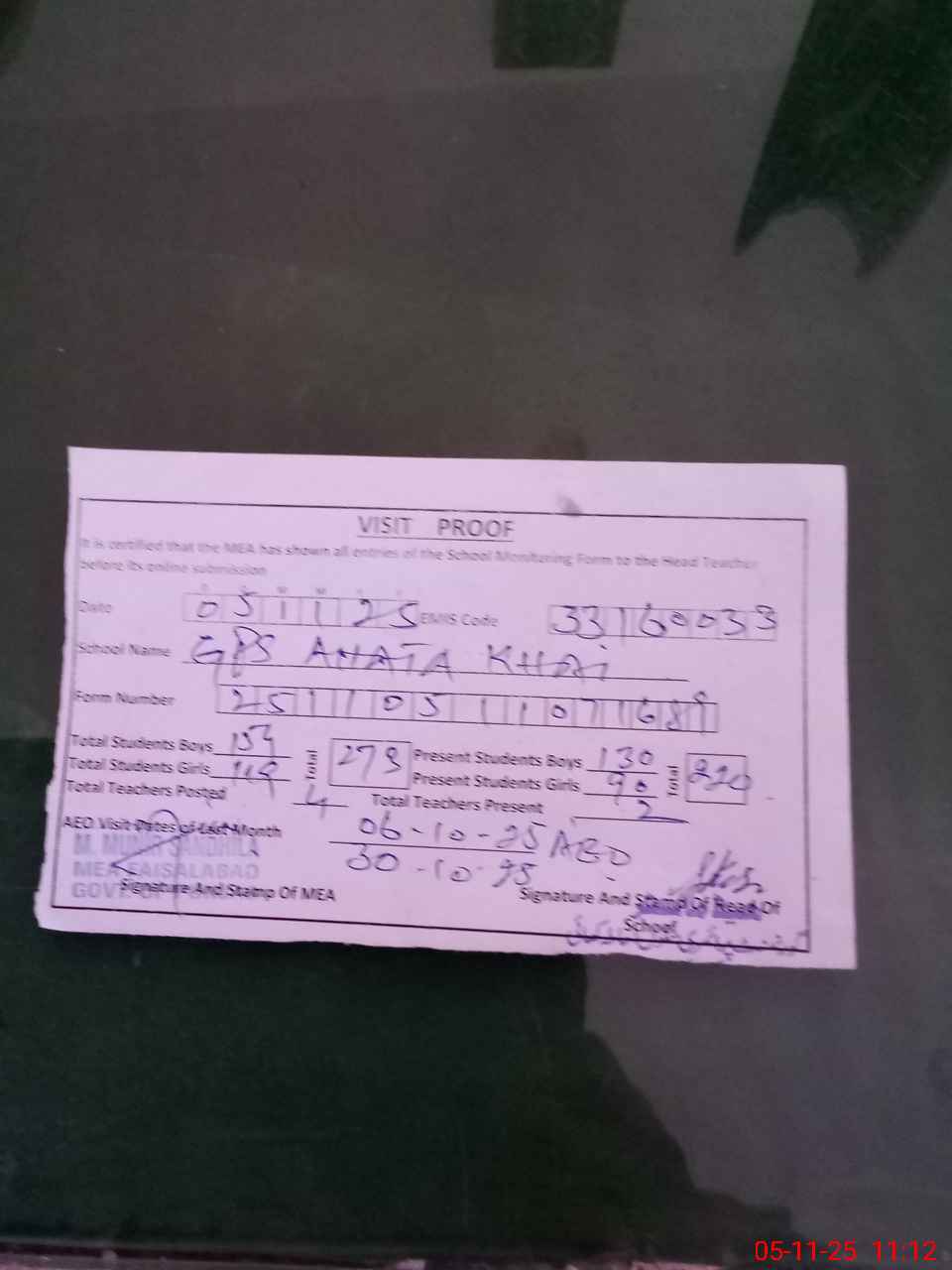 | EMIS Code: 33160033 | Name of School: GPS AHATA KHAI TANDLIANWALA | |||