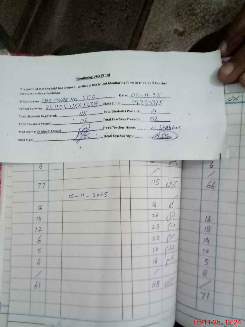 | Attendance Register | Head Teacher | MEA with School | Visit Proof |