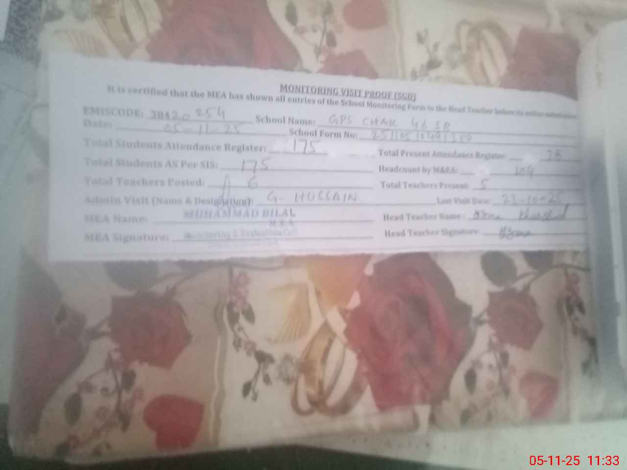 | Attendance Register | Head Teacher | MEA with School | Visit Proof |