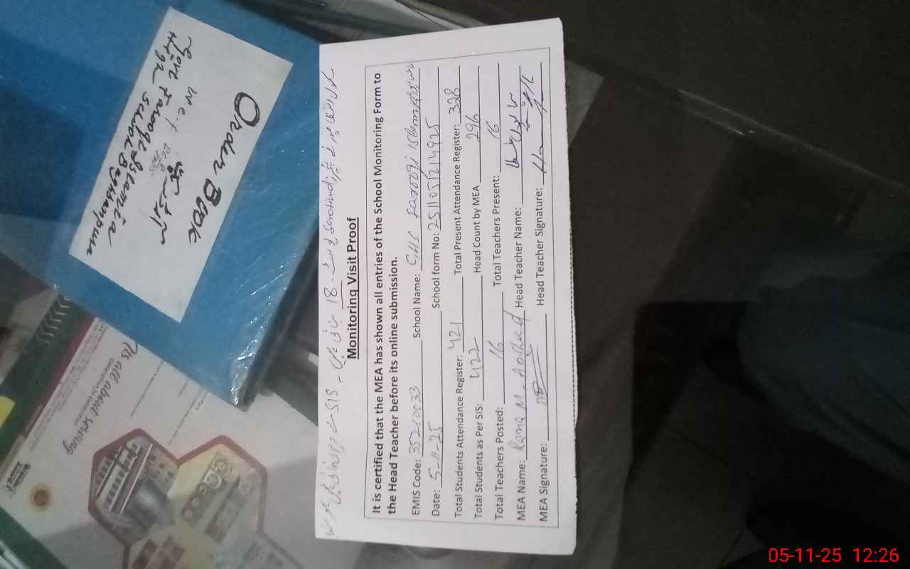 | Remarks (Use Separate Page if Required): Choukidar Waleed Khan attendance blank on 5 November 2025 and he was not physically present in school so according to monitoring sop mark him Absent today Total enrollment on register 421 Total present students as per register 328 Total students as per SIS 422 Total students as per head count 296 Difference 32 students found Wash rooms and soap parameters poor mark Wash basin very dirty Class rooms cleaning average NSB and FTF record not maintain after July 2025 to date | |||||