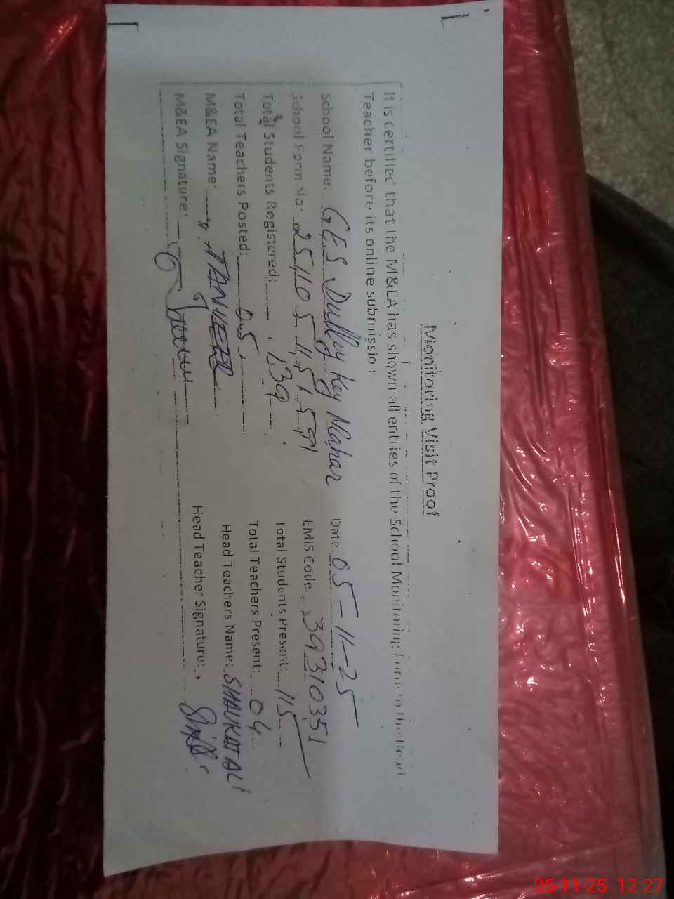 | Attendance Register | Head Teacher | MEA with School | Visit Proof |