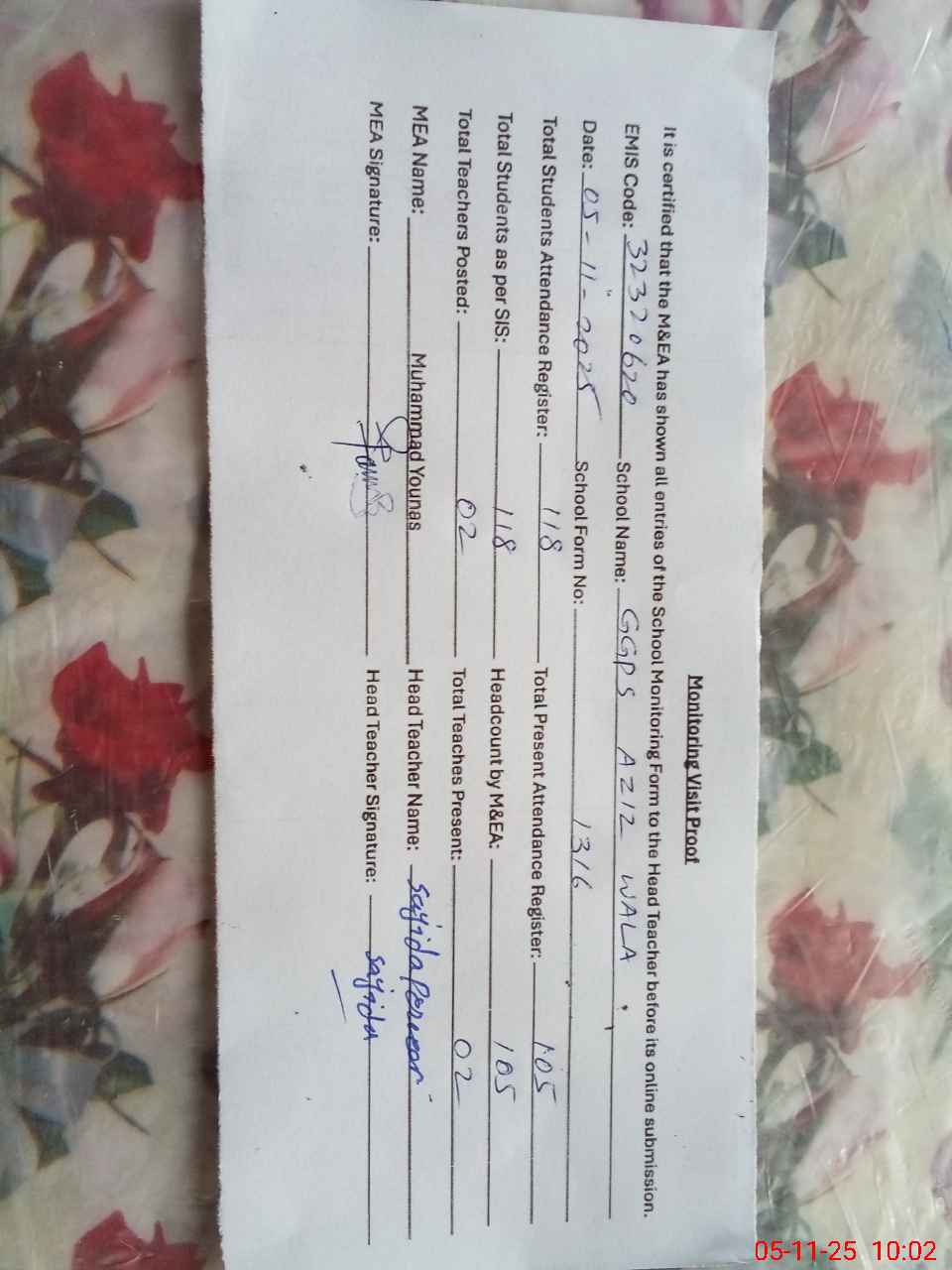 | EMIS Code: 32320620 | Name of School: GGPS AZIZ WALA | |||