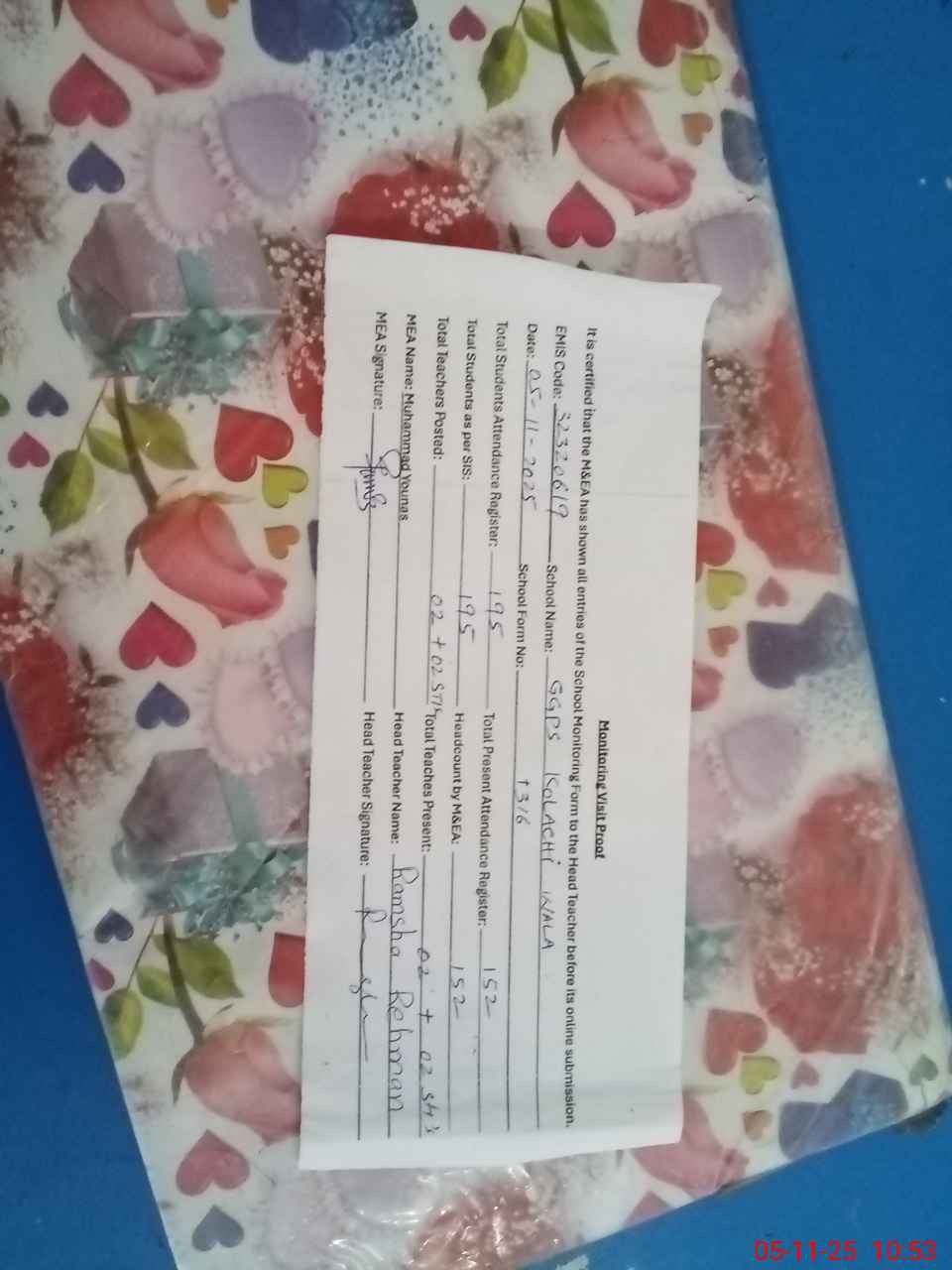 | Attendance Register | Head Teacher | MEA with School | Visit Proof |