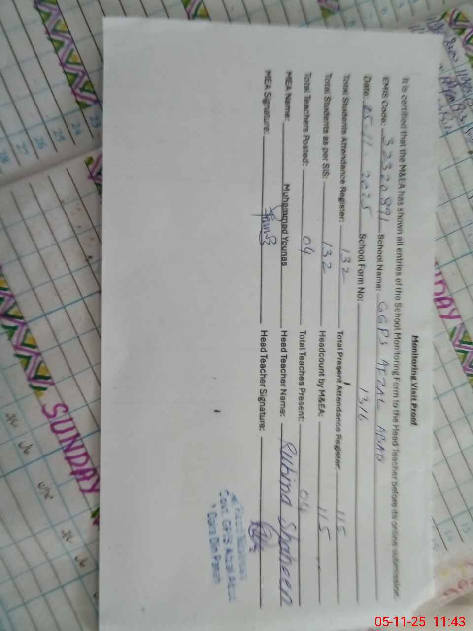 | Attendance Register | Head Teacher | MEA with School | Visit Proof |