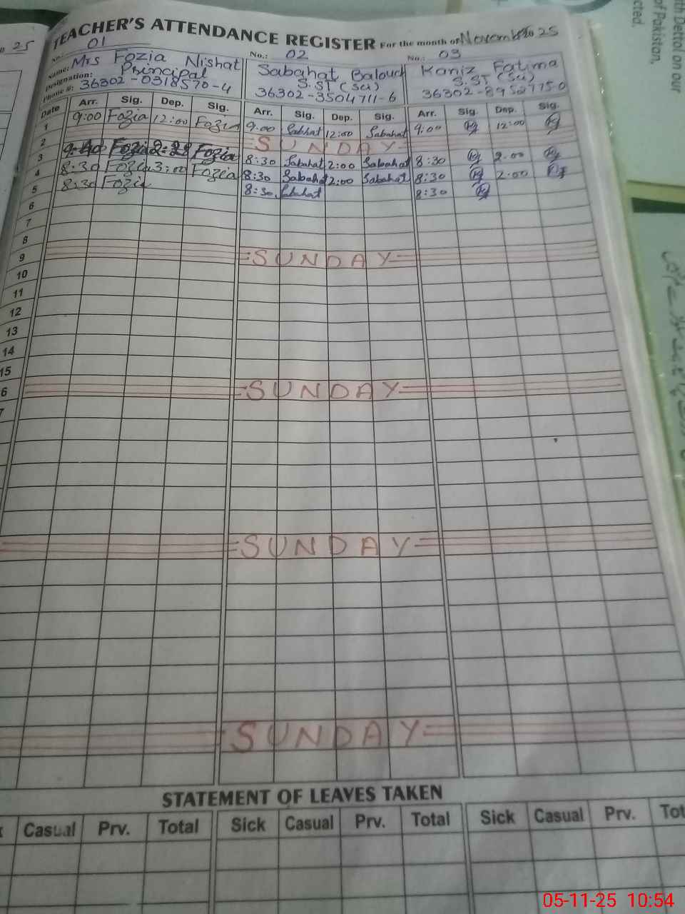 | CNIC | Full Name | Designation | R/C | Absence During Last Calender Month |