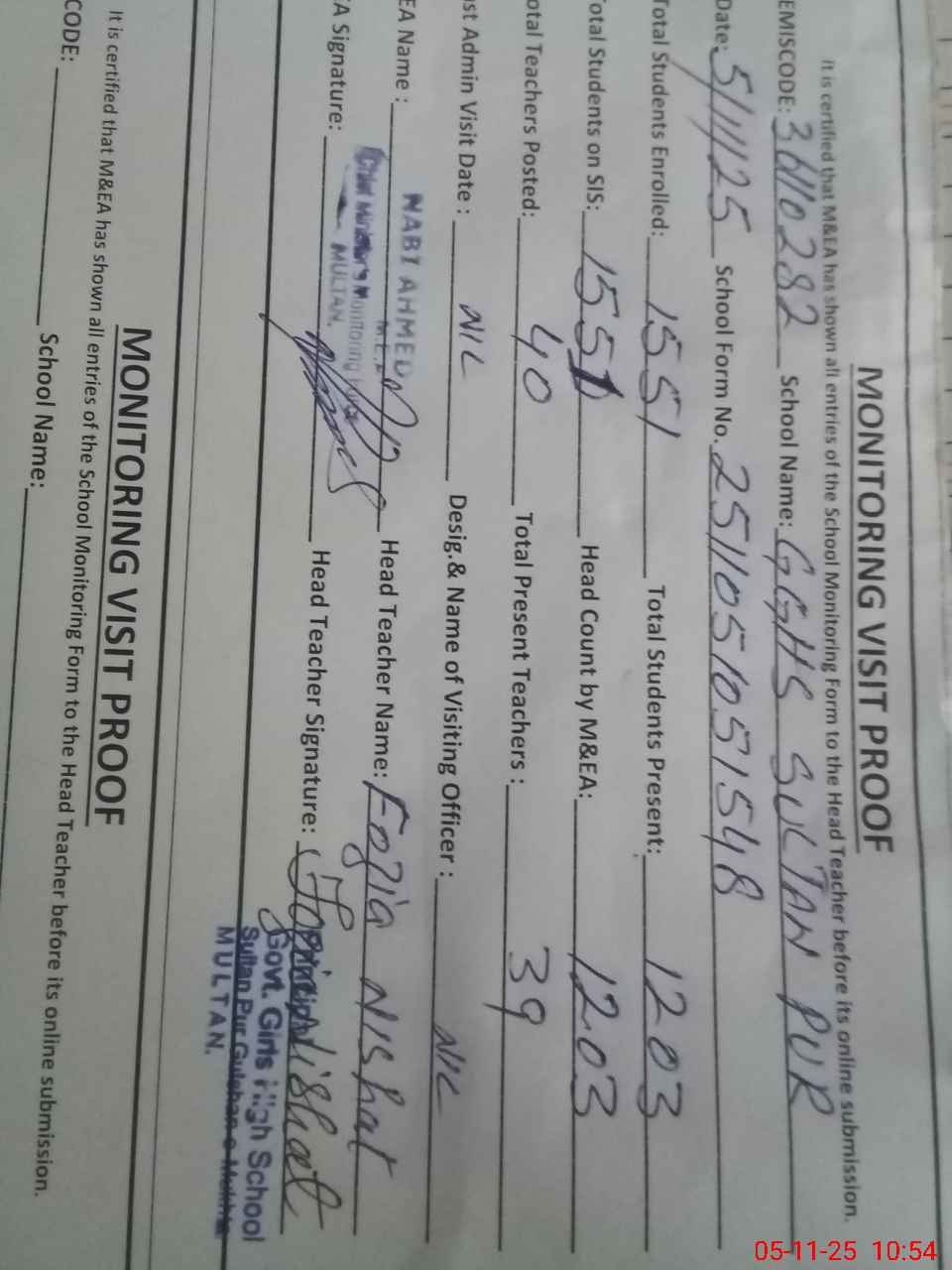 | EMIS Code: 36110282 | Name of School: GGHS SULTAN PURA NEW LATIFABAD MULTAN | |||