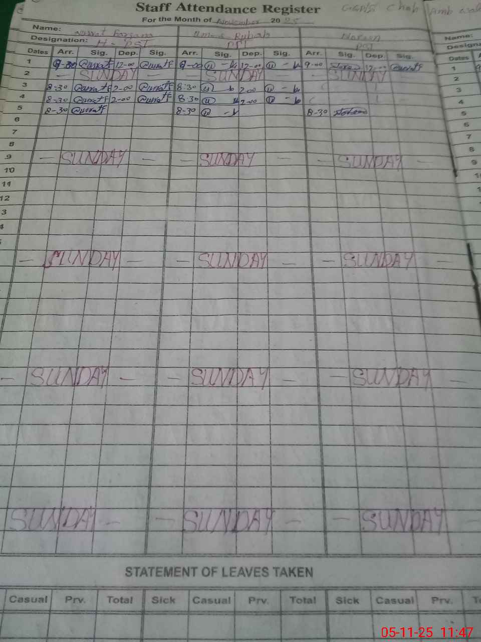 | CNIC | Full Name | Designation | R/C | Absence During Last Calender Month |
