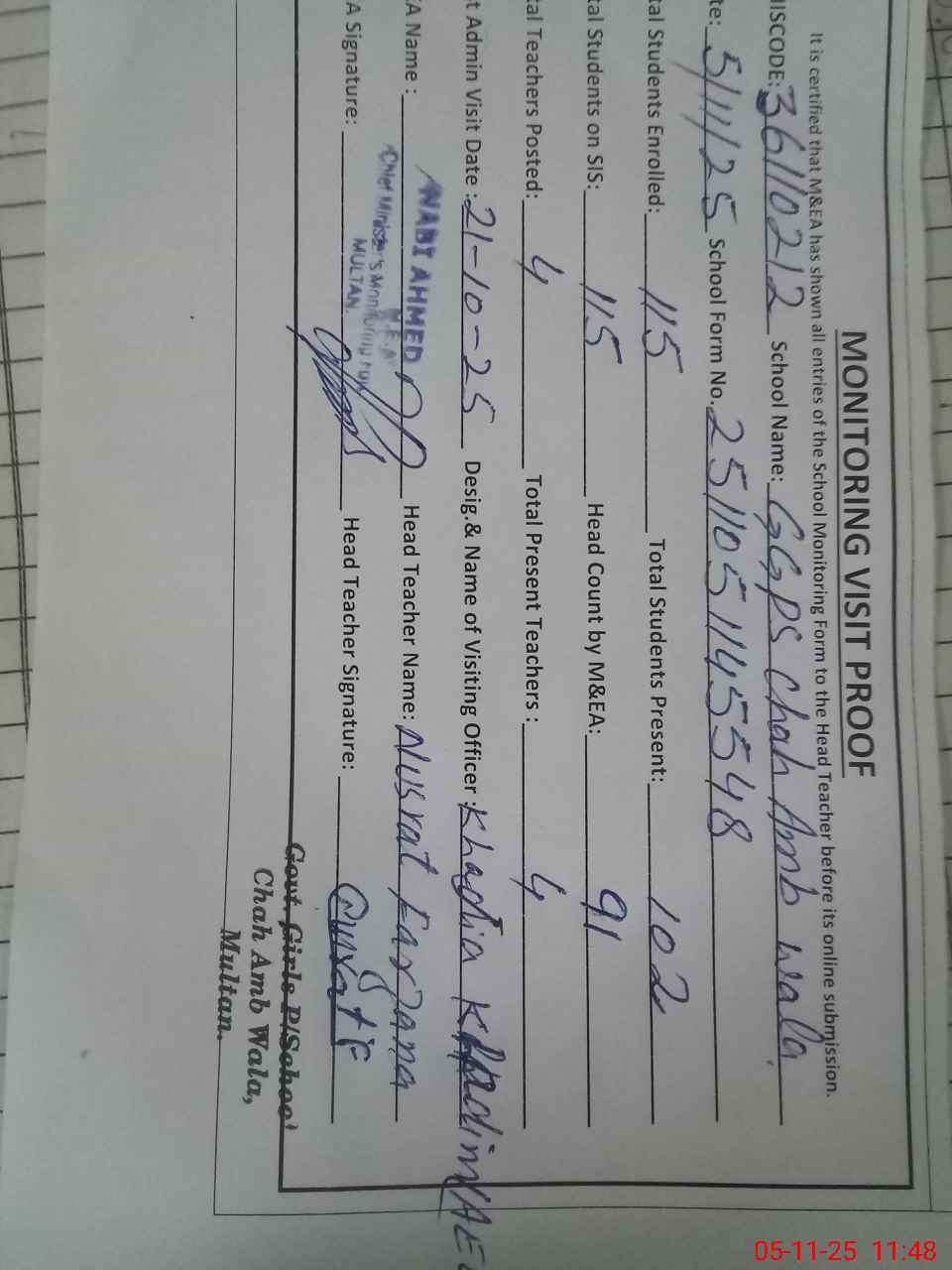 | EMIS Code: 36110212 | Name of School: GGPS CHAH AMB WALA | |||