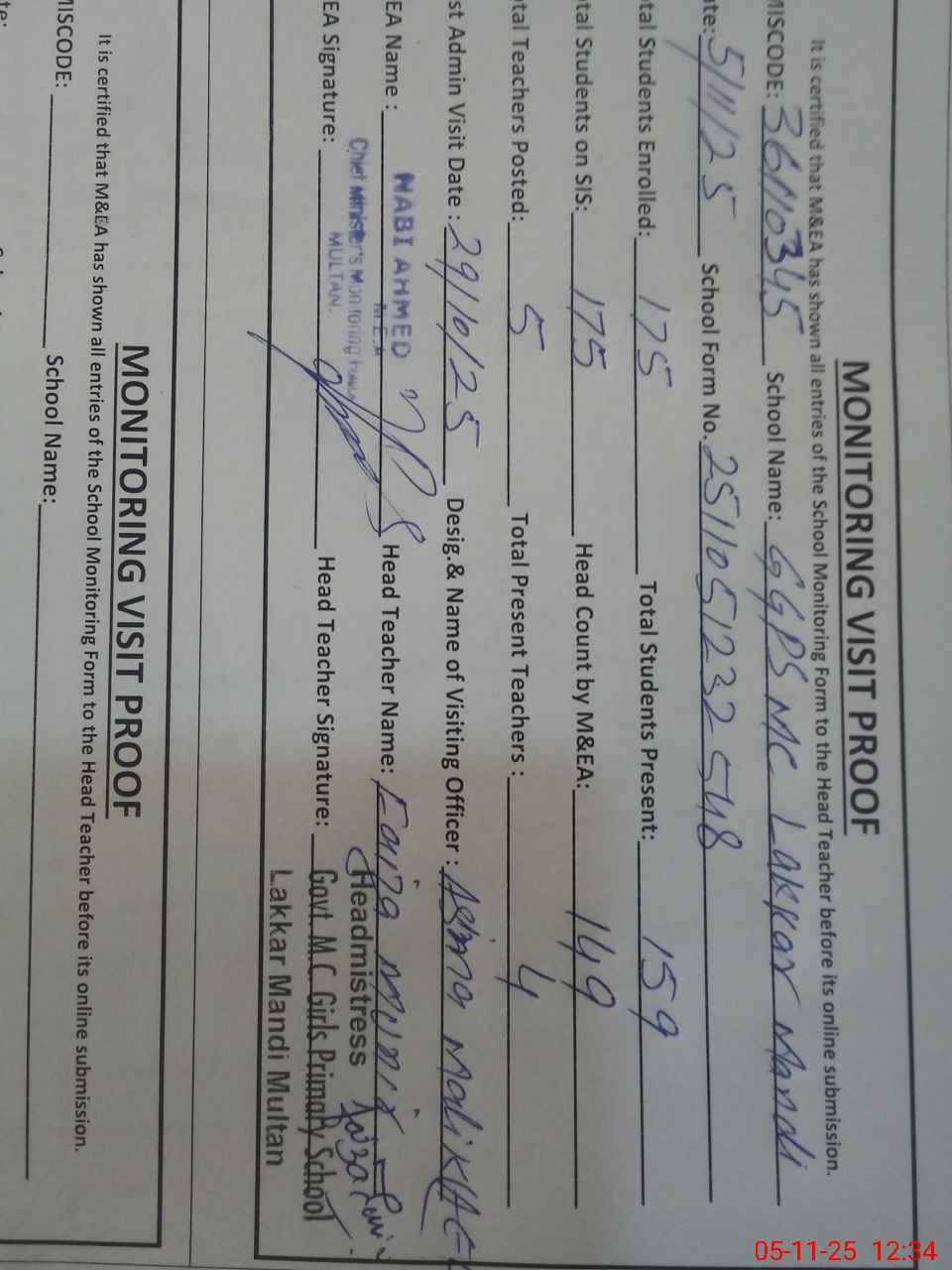 | EMIS Code: 36110345 | Name of School: GGPS MC LAKKAR MANDI MULTAN | |||