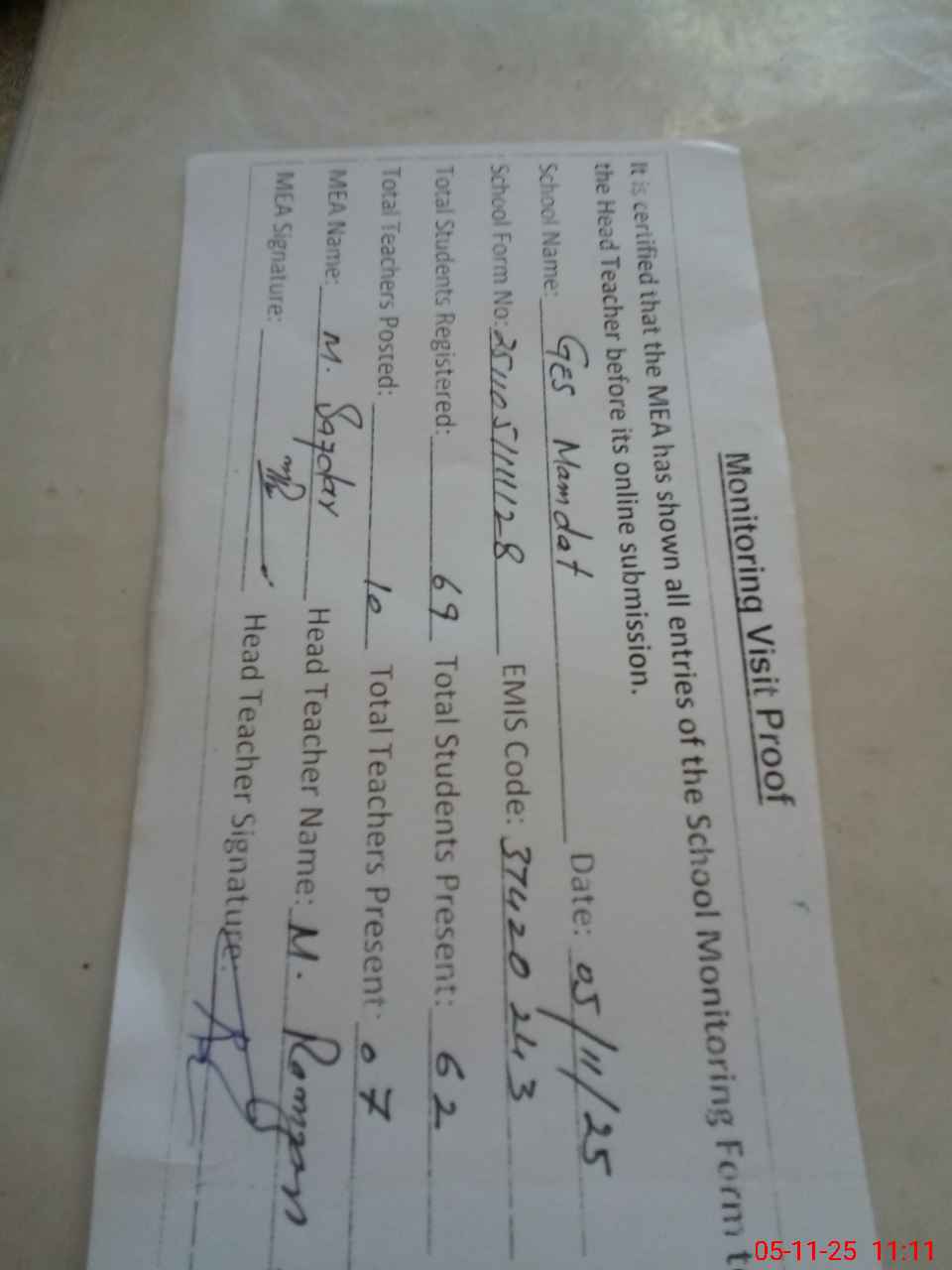 | Attendance Register | Head Teacher | MEA with School | Visit Proof |