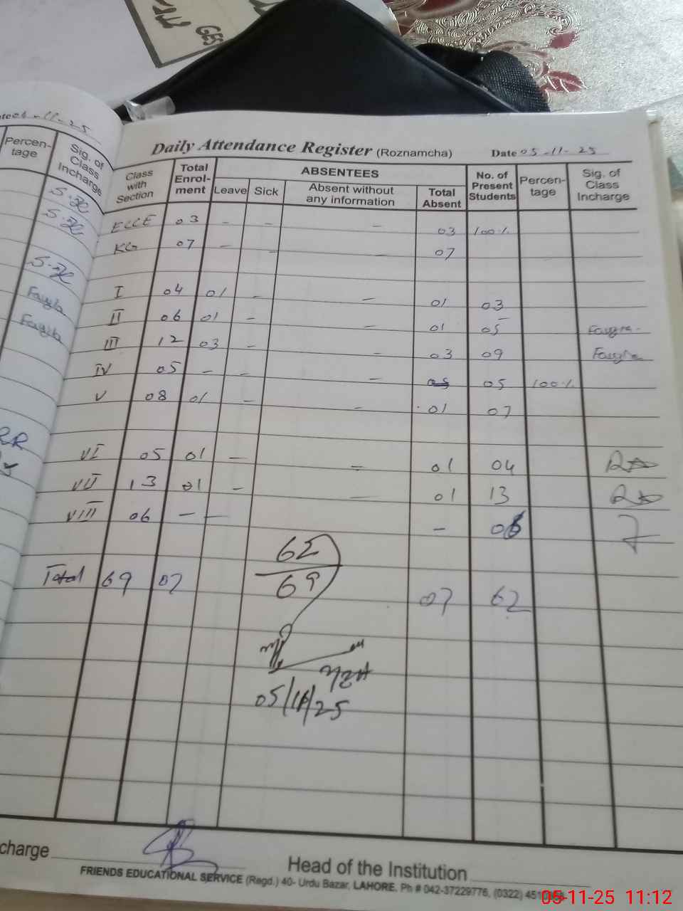 | Total Students Present | 3 | 0 | 7 | 3 | 5 | 9 | 5 | 7 | 4 | 13 | 6 | 62 | ||||