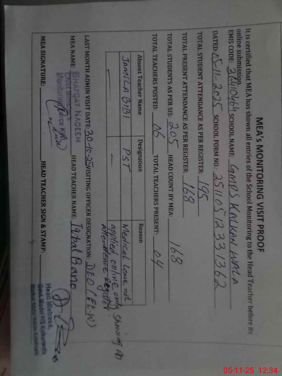 | Attendance Register | Head Teacher | MEA with School | Visit Proof |