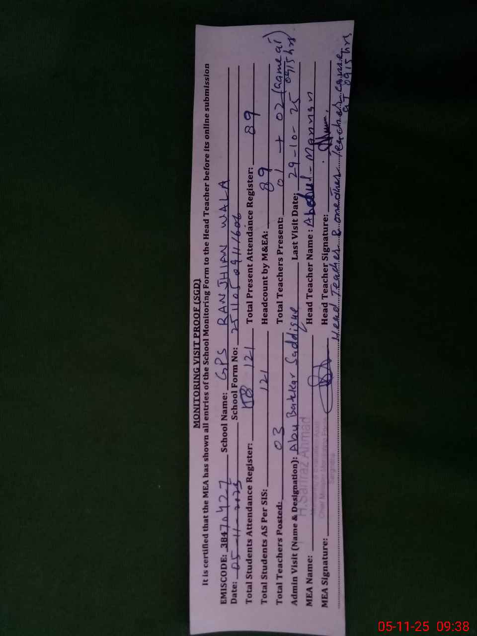 | Remarks (Use Separate Page if Required): Head Teacher Abdul Mannan and PST Ehsanulhaq came at 0915 hours at school so both are marked as unauthorized absent according to SOP | |||||