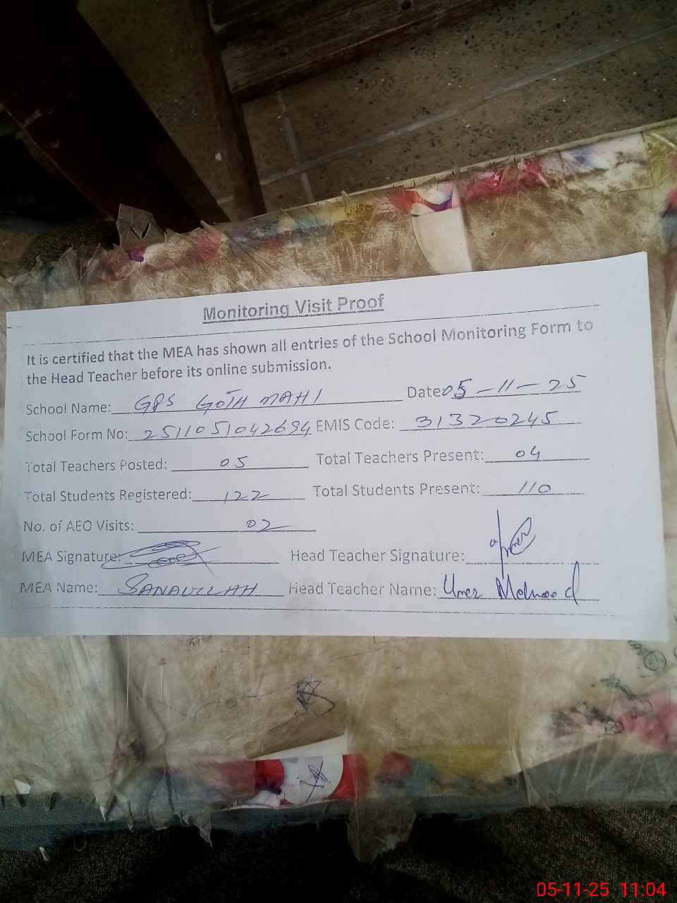 | Attendance Register | Head Teacher | MEA with School | Visit Proof |
