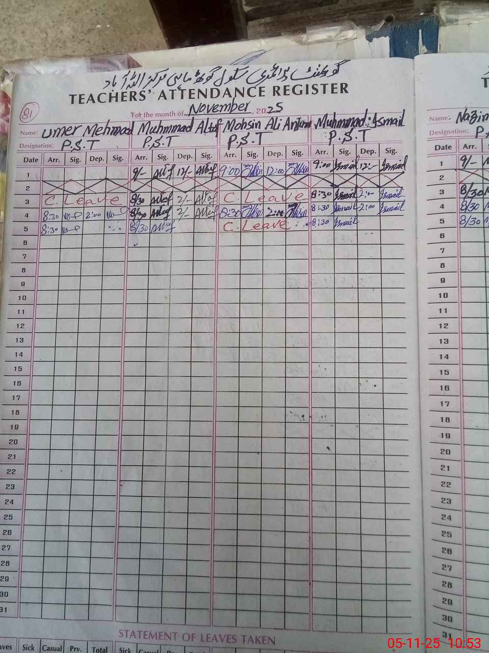 | CNIC | Full Name | Designation | R/C | Absence During Last Calender Month |