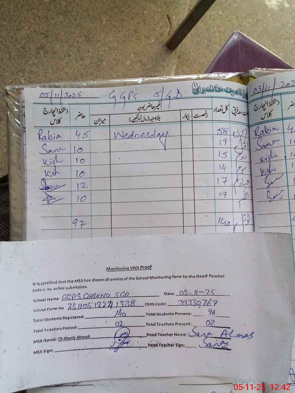 | Attendance Register | Head Teacher | MEA with School | Visit Proof |