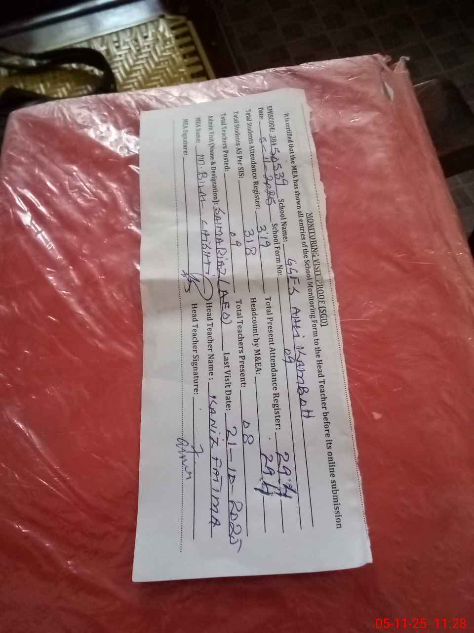 | Attendance Register | Head Teacher | MEA with School | Visit Proof |