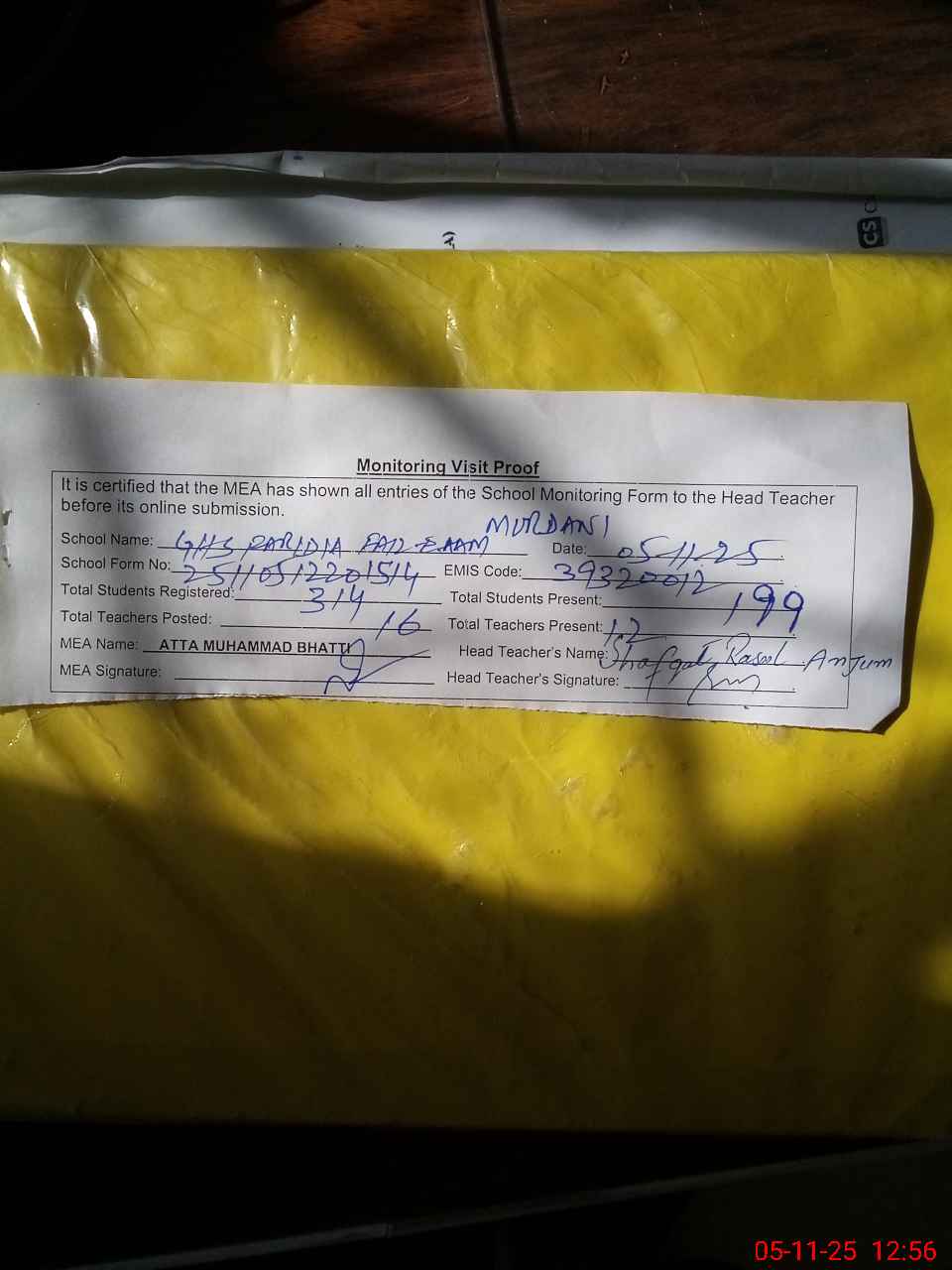 | EMIS Code: 39320012 | Name of School: GHS FARIDIA FAIZ E AAM MURDANI | |||