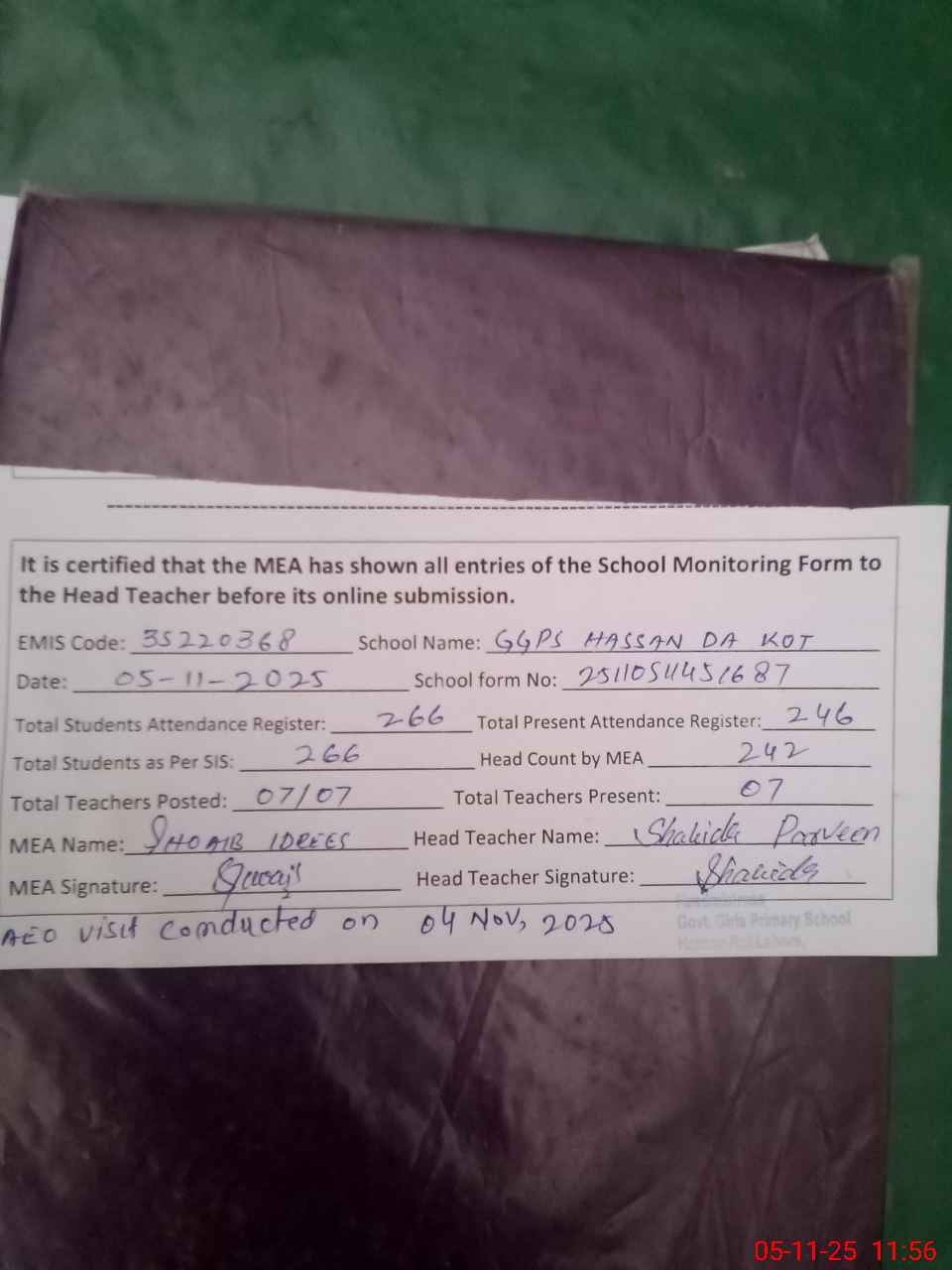 | Remarks (Use Separate Page if Required): 1 AEO Iqra Noreen ashraf conducted last visit on 04 Nov 2025 2 all soaps are missing at students hand washing points EMIS Code 35220368 | |||||
