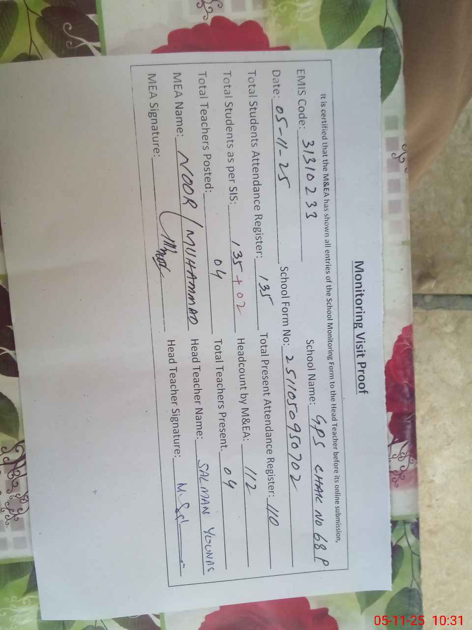 | Attendance Register | Head Teacher | MEA with School | Visit Proof |