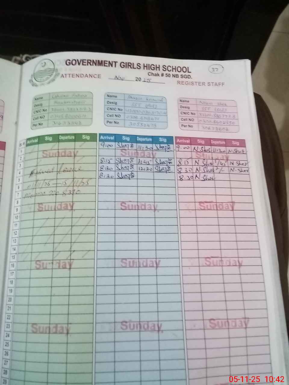 | CNIC | Full Name | Designation | R/C | Absence During Last Calender Month |