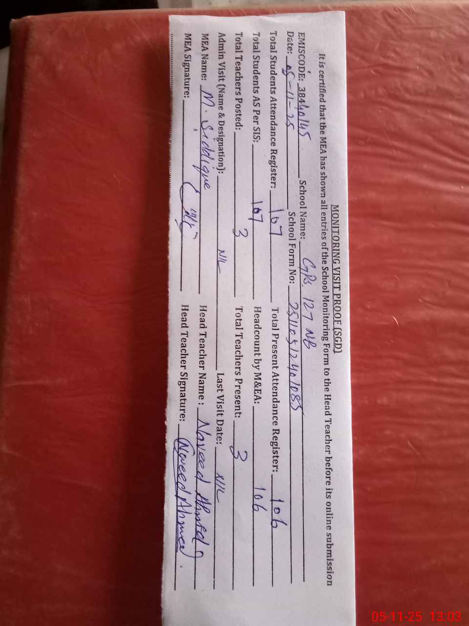 | Attendance Register | Head Teacher | MEA with School | Visit Proof |