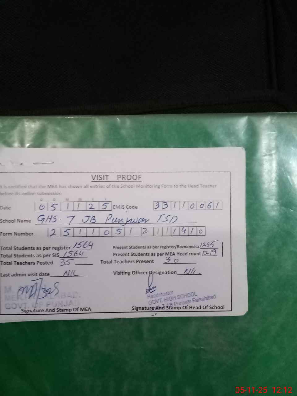 | Attendance Register | Head Teacher | MEA with School | Visit Proof |
