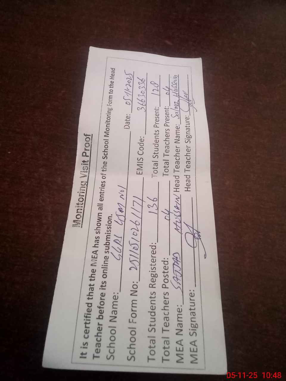 | Attendance Register | Head Teacher | MEA with School | Visit Proof |