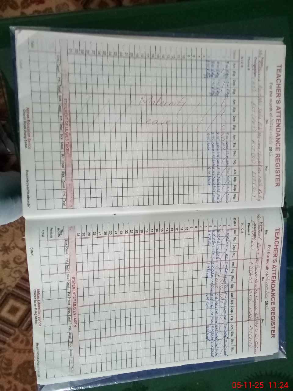 | CNIC | Full Name | Designation | R/C | Absence During Last Calender Month |