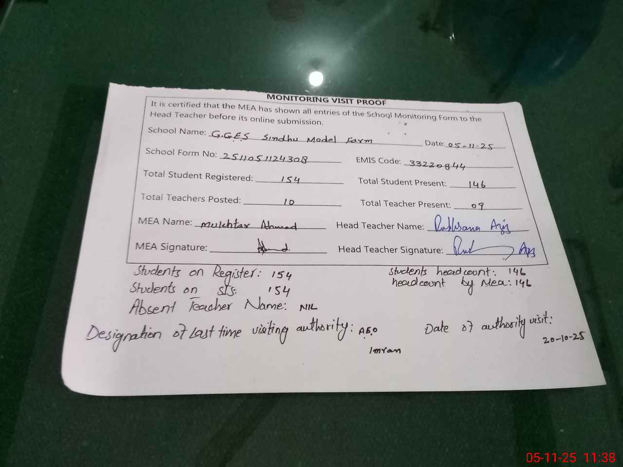 | Attendance Register | Head Teacher | MEA with School | Visit Proof |